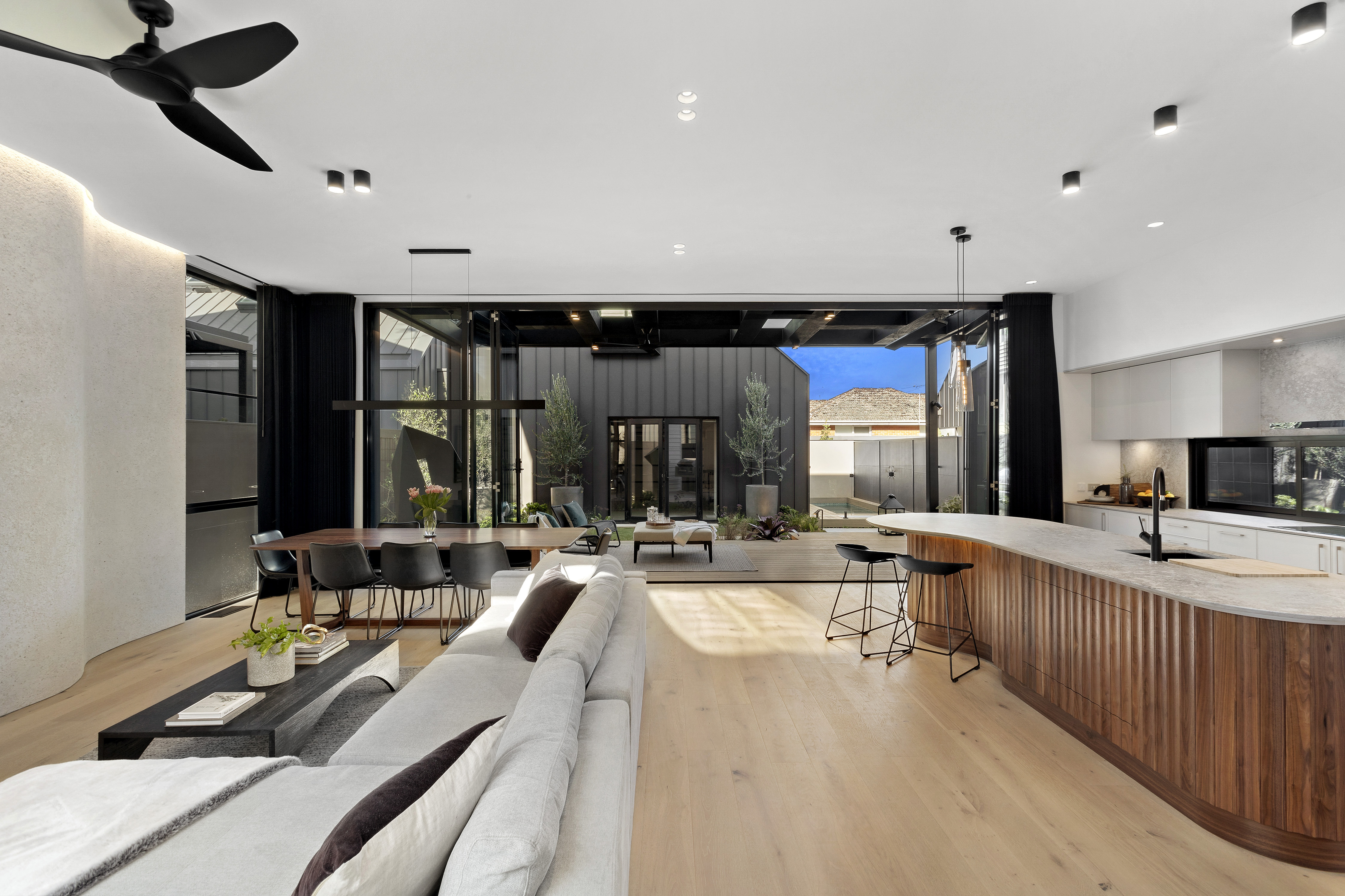 Back downstairs, the ceilings soar in the open-plan kitchen, living and dining. The Art Deco-inspired kitchen delights with a butler’s pantry and mod-cons, but it’s the oversized kitchen island bench by Christian Cole that brings a whole other layer to the winning kitchen design.