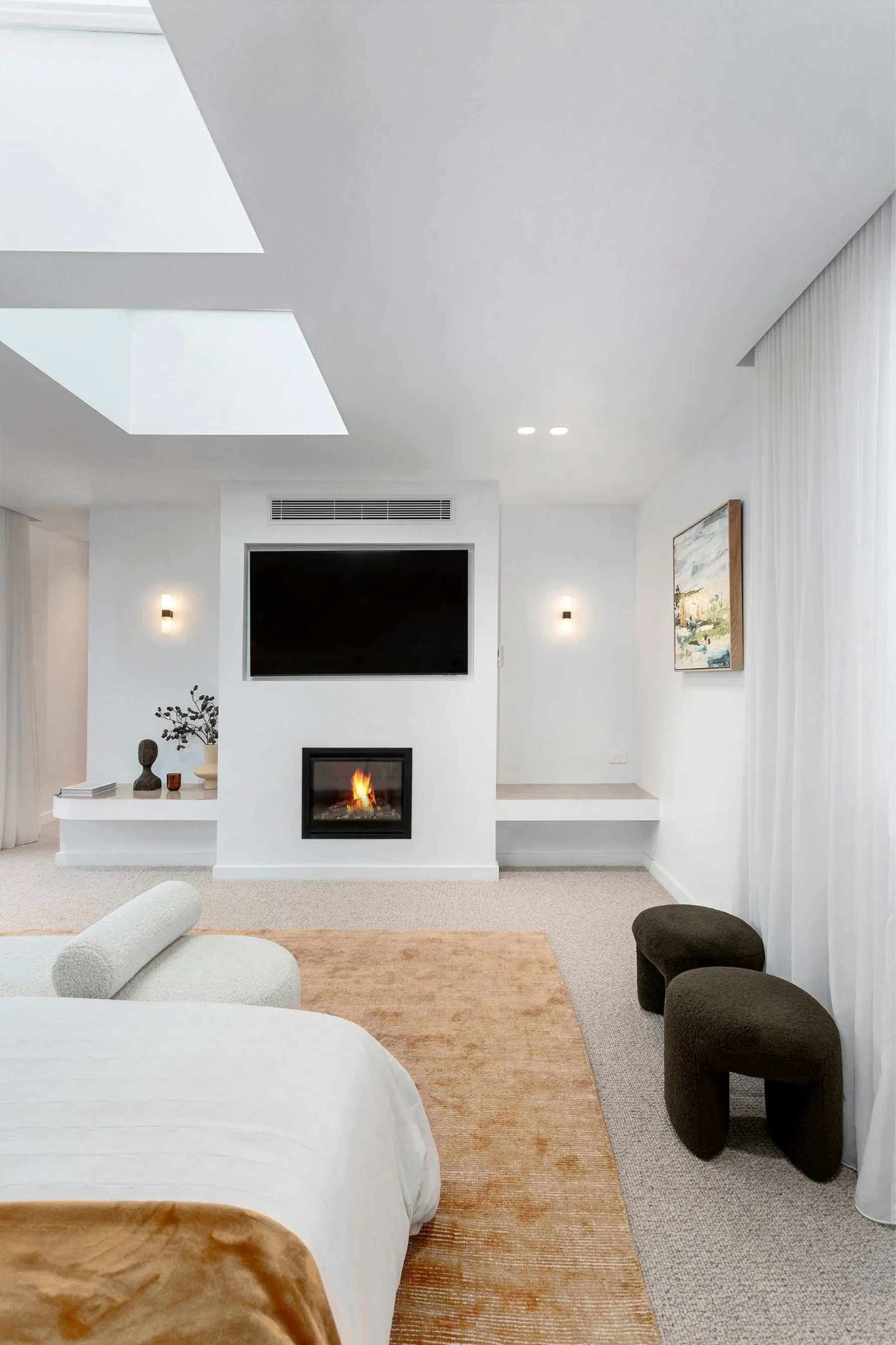 In the first living room, the pair opted for elegant Laminex wall panelling and a high-end Venetian plaster finish to create a timeless, textural feel, making it the perfect haven to relax and unwind. Complete with a stunning Stoke fireplace, this really is one of the cosiest and comfiest areas of the home.