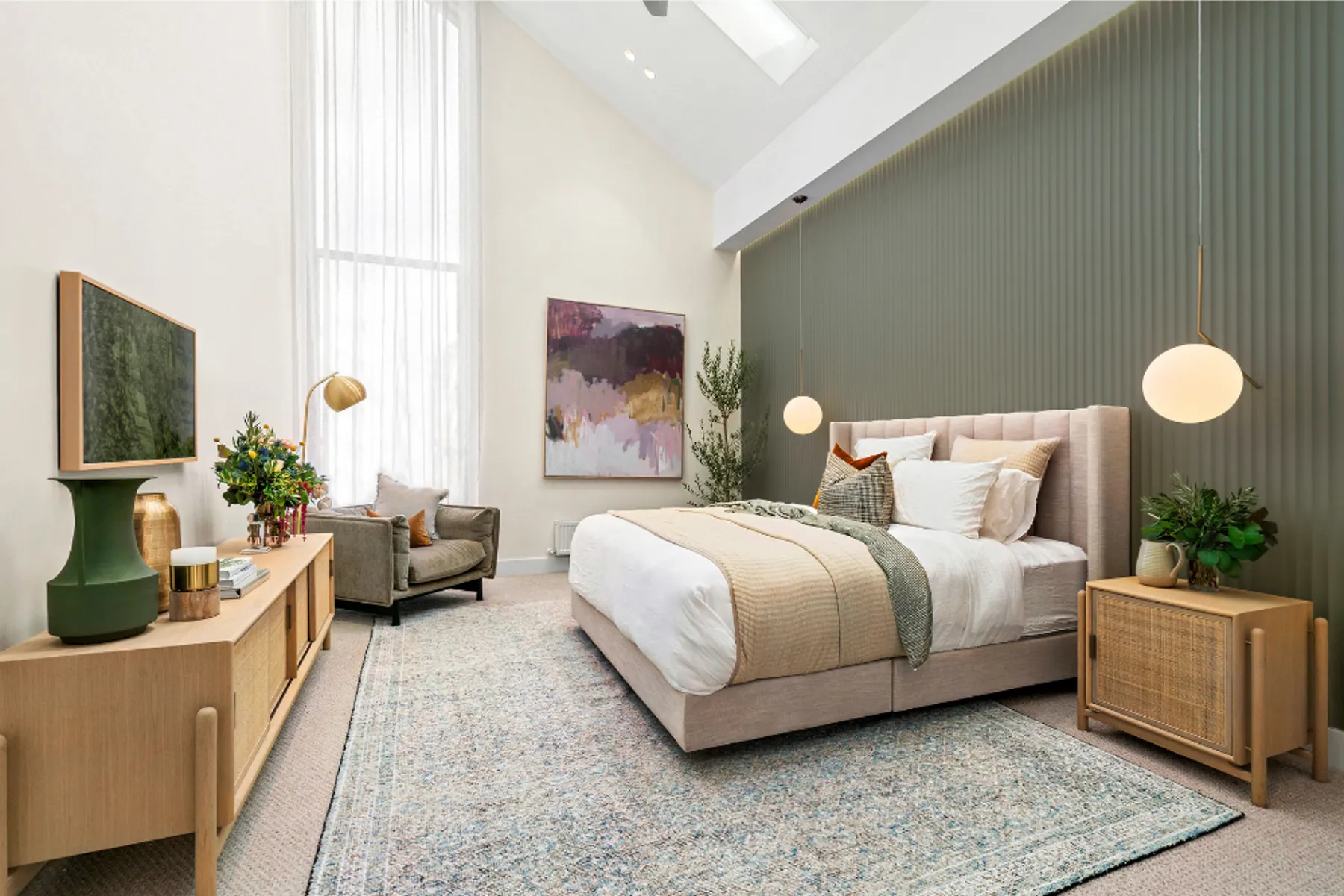 "The overriding design aesthetic is a classic contemporary. It's a very neutral palette with luxe accents – brush brass, beautiful organic sheers, really amazing 100 per cent organic wool carpet, natural oak flooring, and Caesarstone," says Georgia. "It's quite paired back and plays on a material mix, but because the colours are all connecting, it all makes sense."